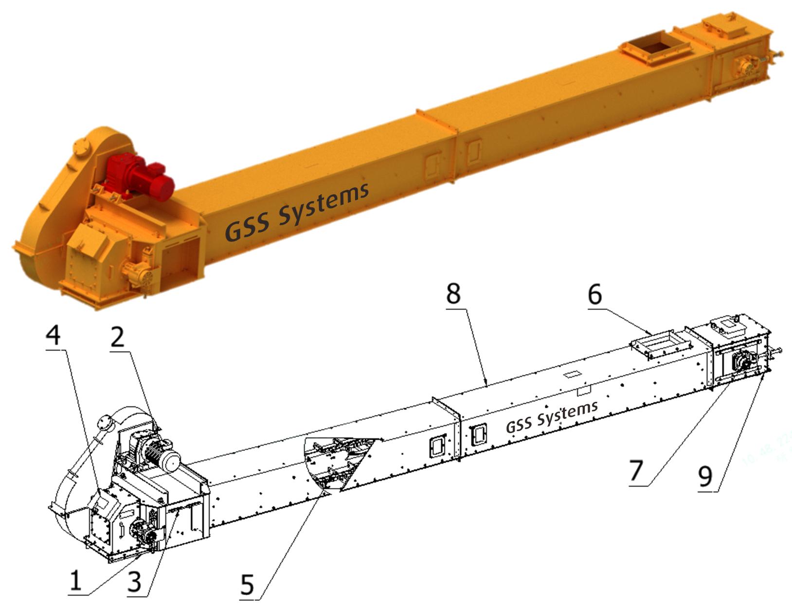 Как показано на рисунке 1, винтовой конвейер состоит из: головной секции, промежуточных секций (жёлоба), хвостовой секции, тяговой цепи с приспособлениями, устройств мониторинга, приводной системы, предохранительных механизмов и вспомогательных компонентов. Тяговая цепь и цепные приспособления соединены и движутся в закрытом корпусе, образуя замкнутую и непрерывную транспортную систему.